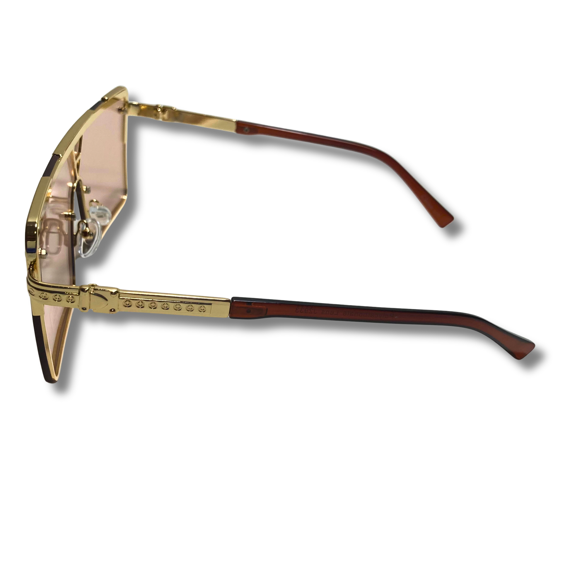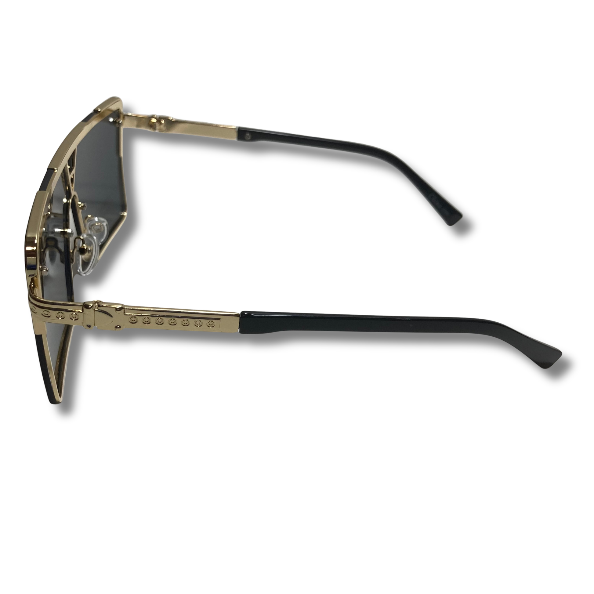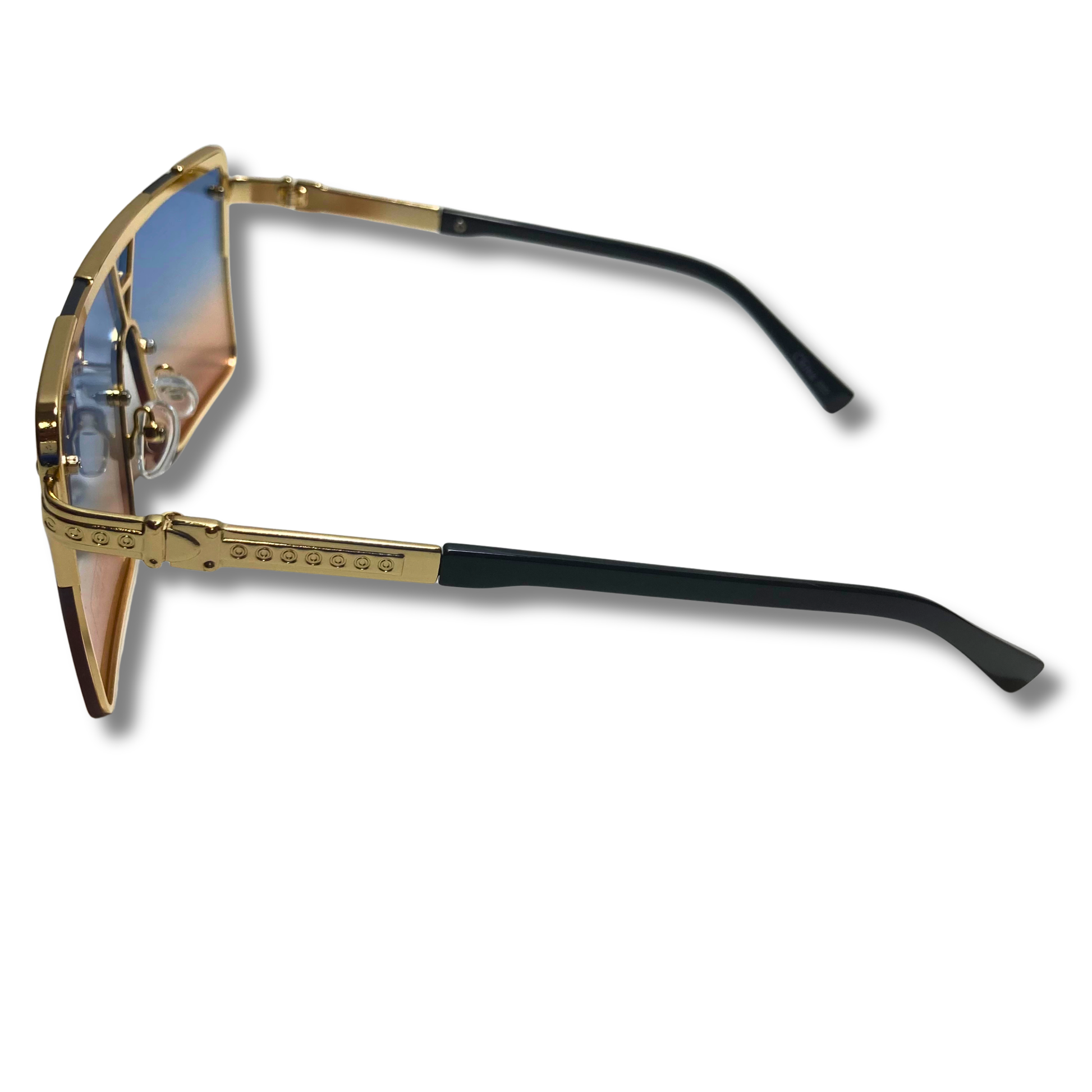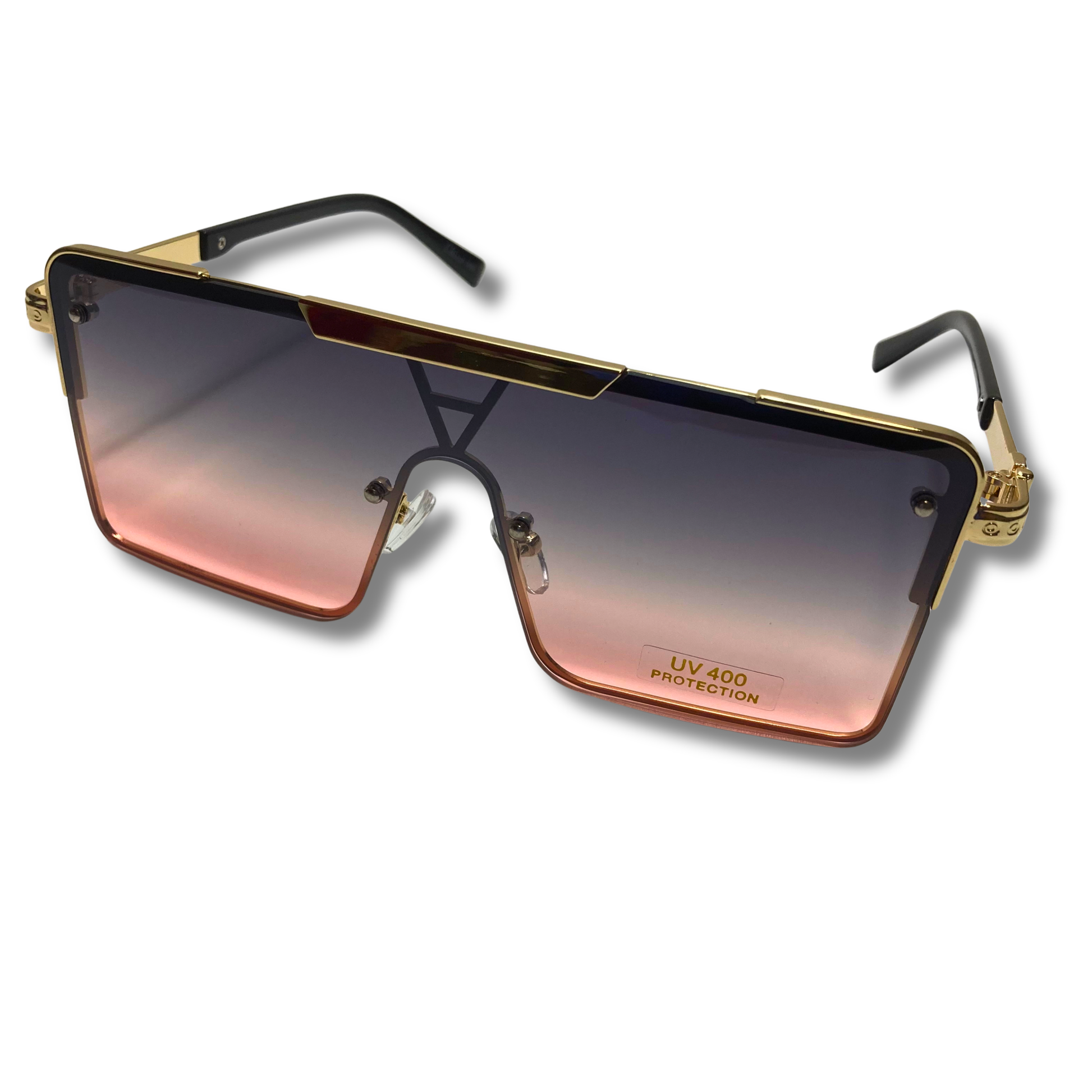 Yerrrrr, The Cardi is bold and fun, a bit like someone we know. These single-lens shield sunglasses feature a heavyweight metal frame with accents around the bridge of the nose, the temples, and along the arms. When you're wearing The Cardi there is nowhere and no one you cannot stunt on... a bit like someone we know. Available in four colors: Gold/Pink & Blue, Gold/Black & Pink, Gold/Black, and Gold/Champagne.