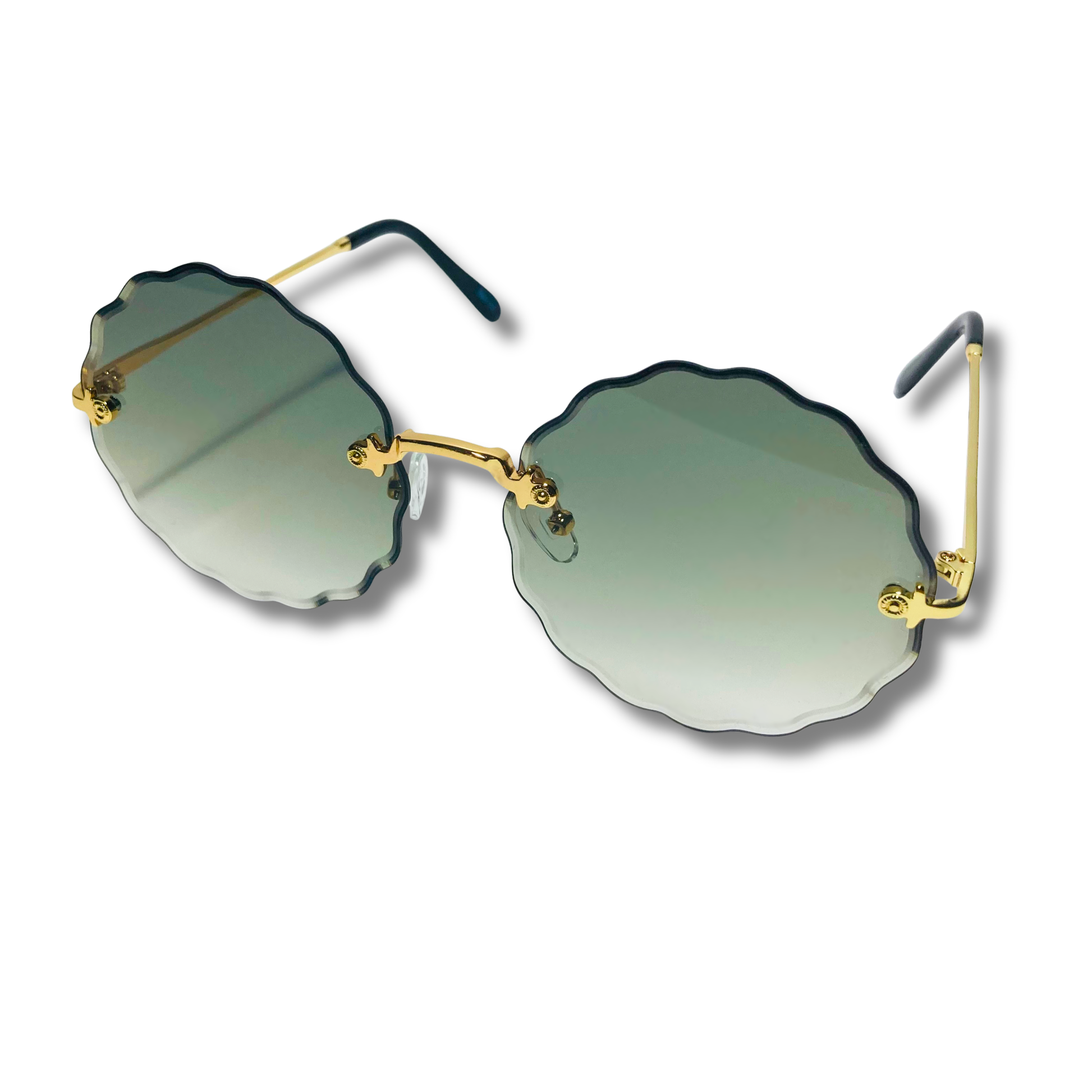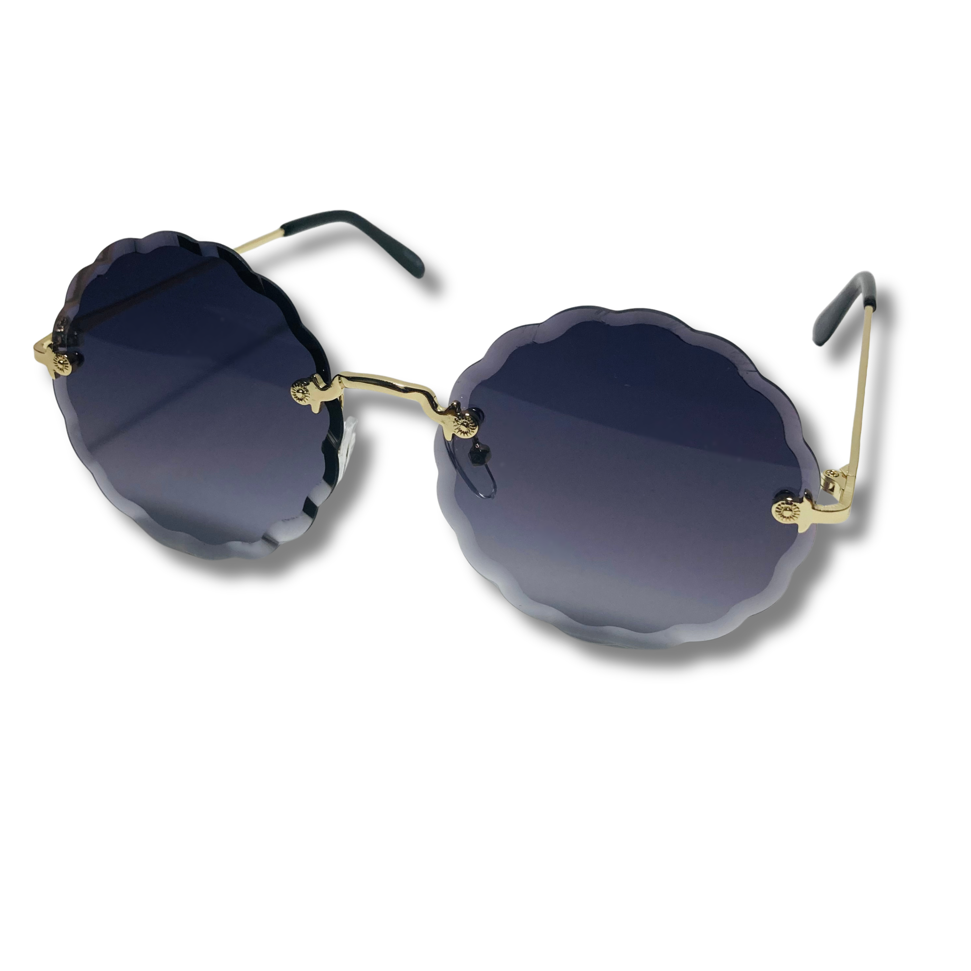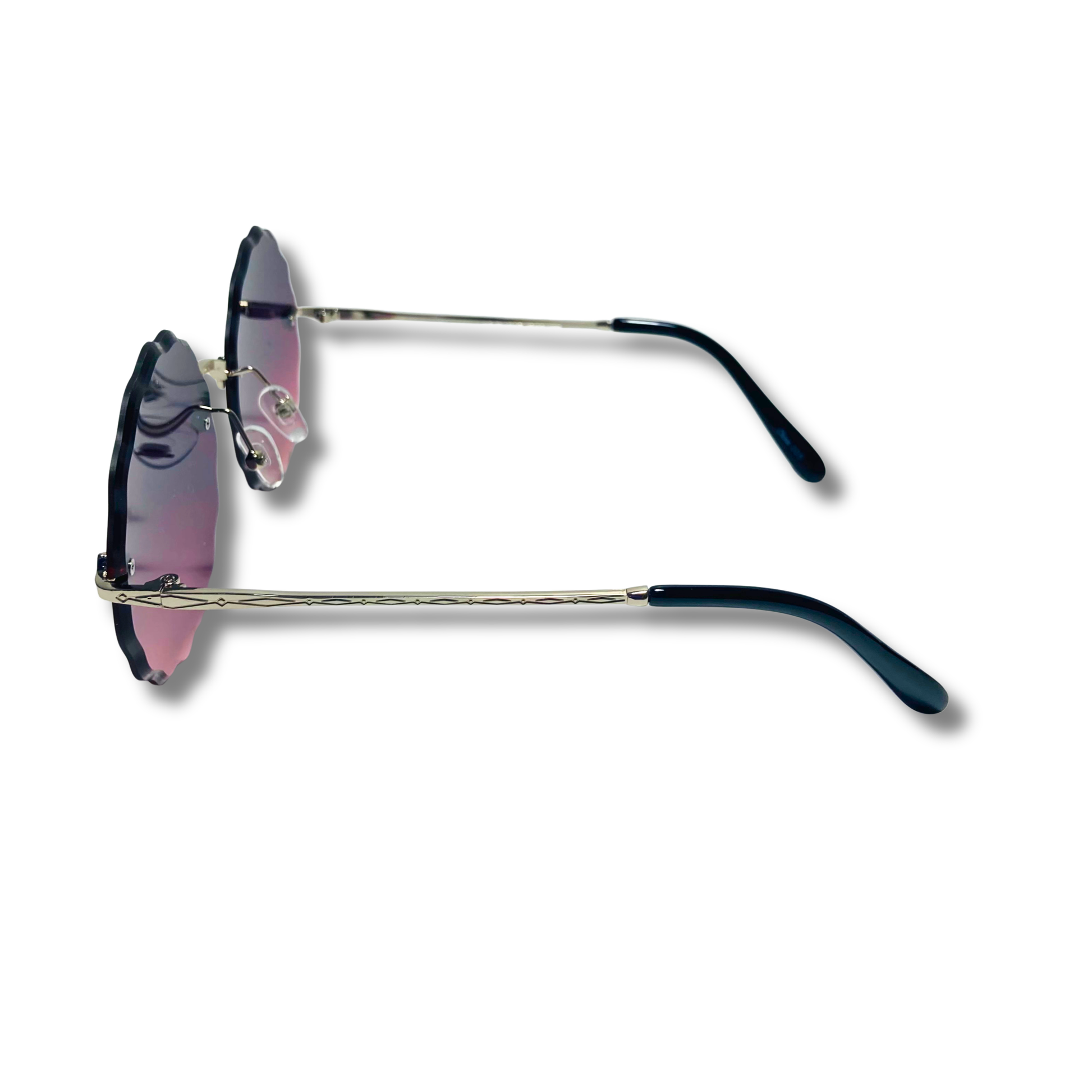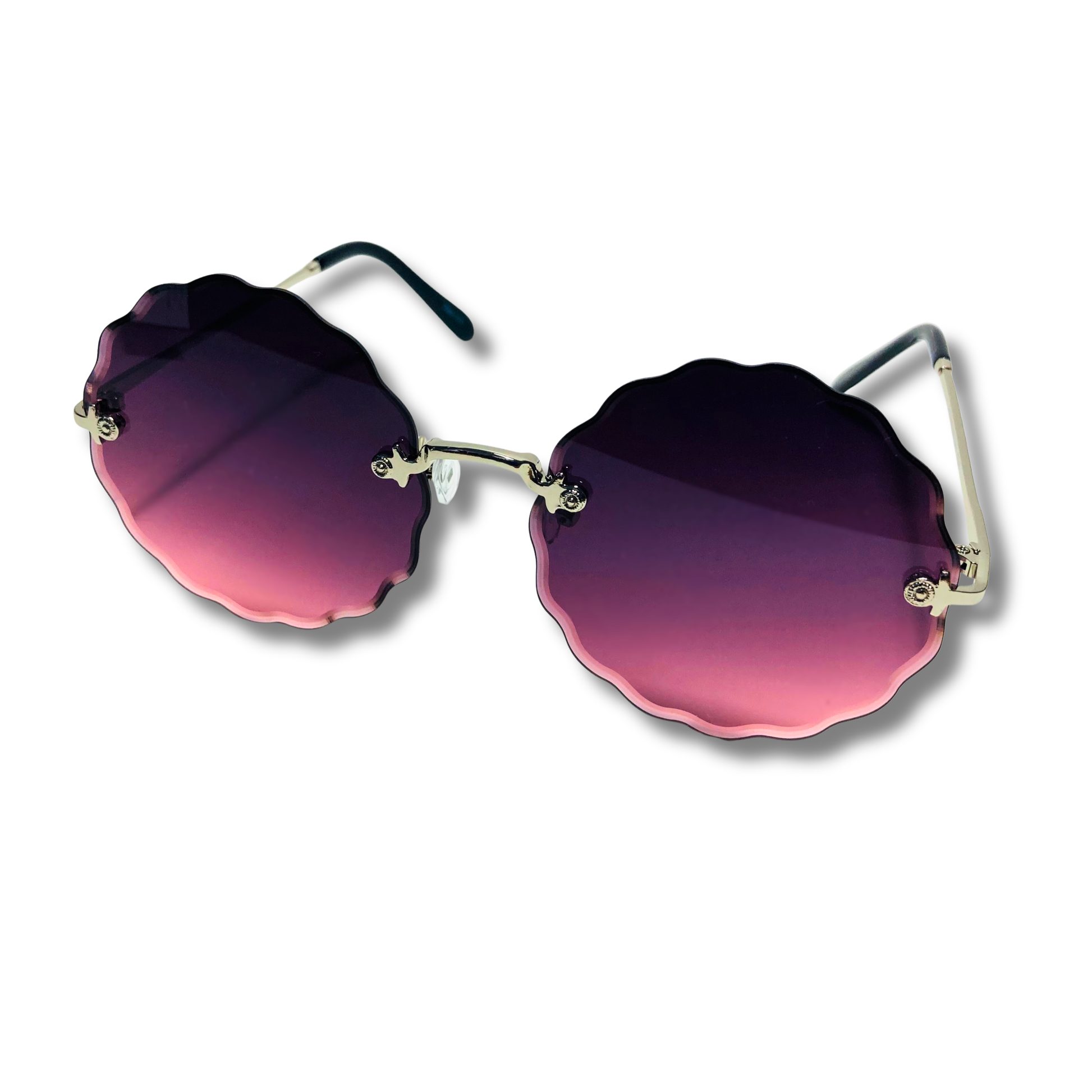 The Nimbus is wavy...it's literally wavy, that isn't our fault, that's just reality. These round sunglasses feature a wavy beveled lens with art-deco nose bridge and metal frame. Available in five colors: silver/purple, silver/pink/blue, gold/gradient black, gold/green, and gold/brown.